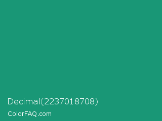 Decimal 2237018708 Color is a normal cyan color and the nearest color is Green Crayola #1cac78. Hex code #199776 and RGB value is rgb(25,151,118). In RGB color space, this color is composed of 10% red, 59% green, 46% blue, In CMYK color space, this color is composed of 83% cyan, 0% magenta, 22% yellow , 41% black , In HSL color space, this color has a hue angle of 164° , 72% saturation and 35% lightness.