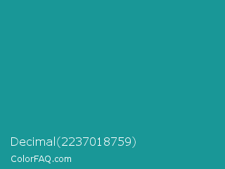 Decimal 2237018759 Color is a normal cyan color and the nearest color is Blue Chill #0c8990. Hex code #199797 and RGB value is rgb(25,151,151). In RGB color space, this color is composed of 10% red, 59% green, 59% blue, In CMYK color space, this color is composed of 83% cyan, 0% magenta, 0% yellow , 41% black , In HSL color space, this color has a hue angle of 180° , 72% saturation and 35% lightness.