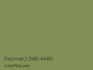 Decimal 139814448 Color is a normal lime color and the nearest color is Moss Green #8a9a5b. Hex code #829056 and RGB value is rgb(130,144,86). In RGB color space, this color is composed of 51% red, 56% green, 34% blue, In CMYK color space, this color is composed of 10% cyan, 0% magenta, 40% yellow , 44% black , In HSL color space, this color has a hue angle of 74° , 25% saturation and 45% lightness.