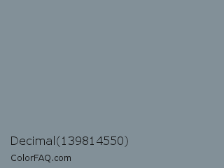 Decimal 139814550 Color is a normal blue color and the nearest color is Roman Silver #838996. Hex code #829098 and RGB value is rgb(130,144,152). In RGB color space, this color is composed of 51% red, 56% green, 60% blue, In CMYK color space, this color is composed of 14% cyan, 5% magenta, 0% yellow , 40% black , In HSL color space, this color has a hue angle of 202° , 10% saturation and 55% lightness.