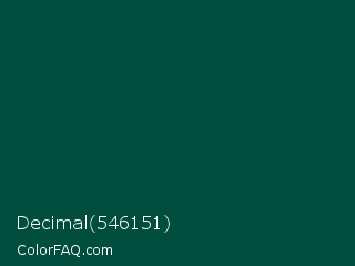 Decimal 546151 Color is a very dark cyan color and the nearest color is Aqua Deep #014b43. Hex code #014e3f and RGB value is rgb(1,78,63). In RGB color space, this color is composed of 0% red, 31% green, 25% blue, In CMYK color space, this color is composed of 99% cyan, 0% magenta, 19% yellow , 69% black , In HSL color space, this color has a hue angle of 168° , 97% saturation and 15% lightness.