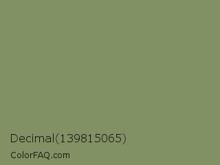 Decimal 139815065 Color is a normal green color and the nearest color is Avocado Pulp #888d65. Hex code #829163 and RGB value is rgb(130,145,99). In RGB color space, this color is composed of 51% red, 57% green, 39% blue, In CMYK color space, this color is composed of 10% cyan, 0% magenta, 32% yellow , 43% black , In HSL color space, this color has a hue angle of 80° , 19% saturation and 48% lightness.