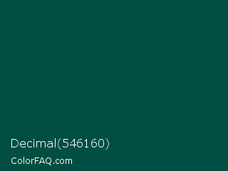 Decimal 546160 Color is a very dark cyan color and the nearest color is Aqua Deep #014b43. Hex code #014e42 and RGB value is rgb(1,78,66). In RGB color space, this color is composed of 0% red, 31% green, 26% blue, In CMYK color space, this color is composed of 99% cyan, 0% magenta, 15% yellow , 69% black , In HSL color space, this color has a hue angle of 171° , 97% saturation and 15% lightness.