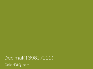 Decimal 139817111 Color is a normal yellow color and the nearest color is Wasabi #788a25. Hex code #829229 and RGB value is rgb(130,146,41). In RGB color space, this color is composed of 51% red, 57% green, 16% blue, In CMYK color space, this color is composed of 11% cyan, 0% magenta, 72% yellow , 43% black , In HSL color space, this color has a hue angle of 69° , 56% saturation and 37% lightness.