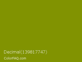 Decimal 139817747 Color is a dark yellow color and the nearest color is Olive #808000. Hex code #829301 and RGB value is rgb(130,147,1). In RGB color space, this color is composed of 51% red, 58% green, 0% blue, In CMYK color space, this color is composed of 12% cyan, 0% magenta, 99% yellow , 42% black , In HSL color space, this color has a hue angle of 67° , 99% saturation and 29% lightness.
