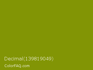 Decimal 139819049 Color is a dark yellow color and the nearest color is Limeade #6f9d02. Hex code #829505 and RGB value is rgb(130,149,5). In RGB color space, this color is composed of 51% red, 58% green, 2% blue, In CMYK color space, this color is composed of 13% cyan, 0% magenta, 97% yellow , 42% black , In HSL color space, this color has a hue angle of 68° , 94% saturation and 30% lightness.