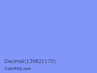 Decimal 139821170 Color is a light blue color and the nearest color is Portage #8b9fee. Hex code #8295f8 and RGB value is rgb(130,149,248). In RGB color space, this color is composed of 51% red, 58% green, 97% blue, In CMYK color space, this color is composed of 48% cyan, 40% magenta, 0% yellow , 3% black , In HSL color space, this color has a hue angle of 230° , 89% saturation and 74% lightness.
