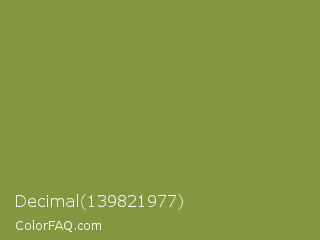 Decimal 139821977 Color is a normal lime color and the nearest color is Sycamore #908d39. Hex code #82973f and RGB value is rgb(130,151,63). In RGB color space, this color is composed of 51% red, 59% green, 25% blue, In CMYK color space, this color is composed of 14% cyan, 0% magenta, 58% yellow , 41% black , In HSL color space, this color has a hue angle of 74° , 41% saturation and 42% lightness.