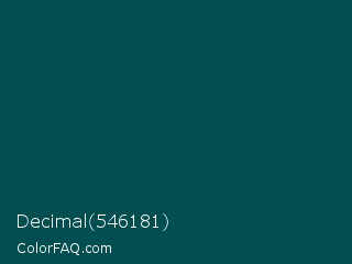 Decimal 546181 Color is a very dark cyan color and the nearest color is Sherpa Blue #004950. Hex code #014e51 and RGB value is rgb(1,78,81). In RGB color space, this color is composed of 0% red, 31% green, 32% blue, In CMYK color space, this color is composed of 99% cyan, 4% magenta, 0% yellow , 68% black , In HSL color space, this color has a hue angle of 182° , 98% saturation and 16% lightness.