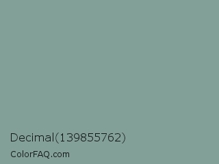 Decimal 139855762 Color is a normal cyan color and the nearest color is Granny Smith #84a0a0. Hex code #82a098 and RGB value is rgb(130,160,152). In RGB color space, this color is composed of 51% red, 63% green, 60% blue, In CMYK color space, this color is composed of 19% cyan, 0% magenta, 5% yellow , 37% black , In HSL color space, this color has a hue angle of 164° , 14% saturation and 57% lightness.