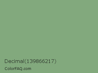 Decimal 139866217 Color is a normal green color and the nearest color is Amulet #7b9f80. Hex code #82a97d and RGB value is rgb(130,169,125). In RGB color space, this color is composed of 51% red, 66% green, 49% blue, In CMYK color space, this color is composed of 23% cyan, 0% magenta, 26% yellow , 34% black , In HSL color space, this color has a hue angle of 113° , 20% saturation and 58% lightness.