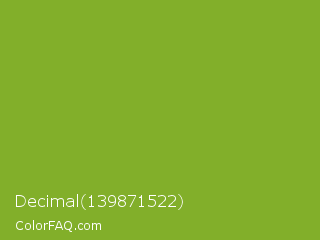 Decimal 139871522 Color is a normal green color and the nearest color is Sushi #87ab39. Hex code #82af2a and RGB value is rgb(130,175,42). In RGB color space, this color is composed of 51% red, 69% green, 16% blue, In CMYK color space, this color is composed of 26% cyan, 0% magenta, 76% yellow , 31% black , In HSL color space, this color has a hue angle of 80° , 61% saturation and 43% lightness.