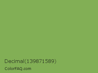 Decimal 139871589 Color is a normal green color and the nearest color is Chelsea Cucumber #83aa5d. Hex code #82af55 and RGB value is rgb(130,175,85). In RGB color space, this color is composed of 51% red, 69% green, 33% blue, In CMYK color space, this color is composed of 26% cyan, 0% magenta, 51% yellow , 31% black , In HSL color space, this color has a hue angle of 90° , 36% saturation and 51% lightness.
