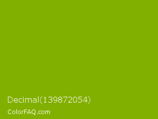 Decimal 139872054 Color is a normal lime color and the nearest color is Apple Green #8db600. Hex code #82b000 and RGB value is rgb(130,176,0). In RGB color space, this color is composed of 51% red, 69% green, 0% blue, In CMYK color space, this color is composed of 26% cyan, 0% magenta, 100% yellow , 31% black , In HSL color space, this color has a hue angle of 76° , 100% saturation and 35% lightness.