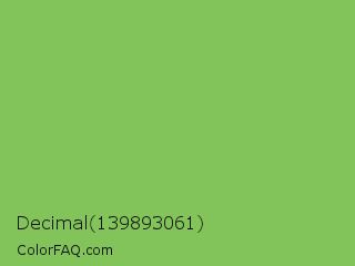 Decimal 139893061 Color is a normal green color and the nearest color is Dollar Bill #85bb65. Hex code #82c459 and RGB value is rgb(130,196,89). In RGB color space, this color is composed of 51% red, 77% green, 35% blue, In CMYK color space, this color is composed of 34% cyan, 0% magenta, 55% yellow , 23% black , In HSL color space, this color has a hue angle of 97° , 48% saturation and 56% lightness.