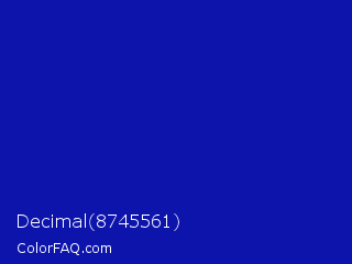 Decimal 8745561 Color is a normal blue color and the nearest color is Zaffre #0014a8. Hex code #0d14ab and RGB value is rgb(13,20,171). In RGB color space, this color is composed of 5% red, 8% green, 67% blue, In CMYK color space, this color is composed of 92% cyan, 88% magenta, 0% yellow , 33% black , In HSL color space, this color has a hue angle of 237° , 86% saturation and 36% lightness.