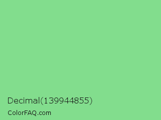 Decimal 139944855 Color is a light green color and the nearest color is Light Green #90ee90. Hex code #82dd8d and RGB value is rgb(130,221,141). In RGB color space, this color is composed of 51% red, 87% green, 55% blue, In CMYK color space, this color is composed of 41% cyan, 0% magenta, 36% yellow , 13% black , In HSL color space, this color has a hue angle of 127° , 57% saturation and 69% lightness.