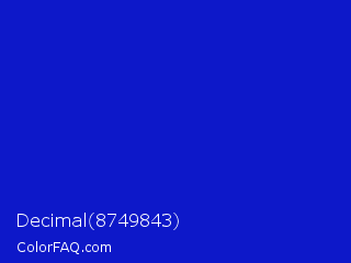 Decimal 8749843 Color is a normal blue color and the nearest color is Dark Blue #0000c8. Hex code #0d18c9 and RGB value is rgb(13,24,201). In RGB color space, this color is composed of 5% red, 9% green, 79% blue, In CMYK color space, this color is composed of 94% cyan, 88% magenta, 0% yellow , 21% black , In HSL color space, this color has a hue angle of 236° , 88% saturation and 42% lightness.