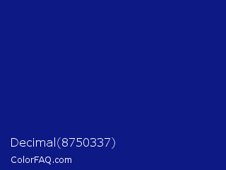 Decimal 8750337 Color is a dark blue color and the nearest color is Indigo Dye #091f92. Hex code #0d1985 and RGB value is rgb(13,25,133). In RGB color space, this color is composed of 5% red, 10% green, 52% blue, In CMYK color space, this color is composed of 90% cyan, 81% magenta, 0% yellow , 48% black , In HSL color space, this color has a hue angle of 234° , 82% saturation and 29% lightness.