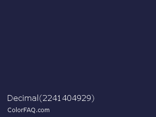 Decimal 2241404929 Color is a very dark blue color and the nearest color is Yankees Blue #1c2841. Hex code #202241 and RGB value is rgb(32,34,65). In RGB color space, this color is composed of 13% red, 13% green, 25% blue, In CMYK color space, this color is composed of 51% cyan, 48% magenta, 0% yellow , 75% black , In HSL color space, this color has a hue angle of 236° , 34% saturation and 19% lightness.