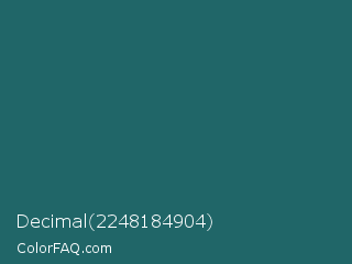 Decimal 2248184904 Color is a dark cyan color and the nearest color is Casal #2f6168. Hex code #206668 and RGB value is rgb(32,102,104). In RGB color space, this color is composed of 13% red, 40% green, 41% blue, In CMYK color space, this color is composed of 69% cyan, 2% magenta, 0% yellow , 59% black , In HSL color space, this color has a hue angle of 182° , 53% saturation and 27% lightness.