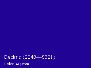 Decimal 2248448321 Color is a dark indigo color and the nearest color is Ultramarine #120a8f. Hex code #210495 and RGB value is rgb(33,4,149). In RGB color space, this color is composed of 13% red, 2% green, 58% blue, In CMYK color space, this color is composed of 78% cyan, 97% magenta, 0% yellow , 42% black , In HSL color space, this color has a hue angle of 252° , 95% saturation and 30% lightness.