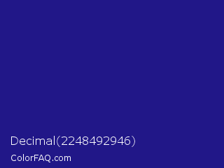 Decimal 2248492946 Color is a normal indigo color and the nearest color is Jacksons Purple #20208d. Hex code #211788 and RGB value is rgb(33,23,136). In RGB color space, this color is composed of 13% red, 9% green, 53% blue, In CMYK color space, this color is composed of 76% cyan, 83% magenta, 0% yellow , 47% black , In HSL color space, this color has a hue angle of 245° , 71% saturation and 31% lightness.
