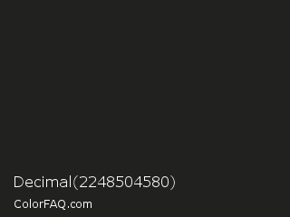 Decimal 2248504580 Color is a very dark green color and the nearest color is Raisin Black #242124. Hex code #212220 and RGB value is rgb(33,34,32). In RGB color space, this color is composed of 13% red, 13% green, 13% blue, In CMYK color space, this color is composed of 3% cyan, 0% magenta, 6% yellow , 87% black , In HSL color space, this color has a hue angle of 90° , 3% saturation and 13% lightness.