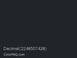 Decimal 2248507428 Color is a very dark blue color and the nearest color is Dark Gunmetal #1f262a. Hex code #212428 and RGB value is rgb(33,36,40). In RGB color space, this color is composed of 13% red, 14% green, 16% blue, In CMYK color space, this color is composed of 18% cyan, 10% magenta, 0% yellow , 84% black , In HSL color space, this color has a hue angle of 214° , 10% saturation and 14% lightness.