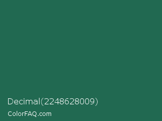 Decimal 2248628009 Color is a dark green color and the nearest color is Green Pea #1d6142. Hex code #216951 and RGB value is rgb(33,105,81). In RGB color space, this color is composed of 13% red, 41% green, 32% blue, In CMYK color space, this color is composed of 69% cyan, 0% magenta, 23% yellow , 59% black , In HSL color space, this color has a hue angle of 160° , 52% saturation and 27% lightness.