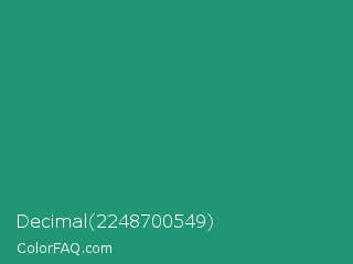 Decimal 2248700549 Color is a normal green color and the nearest color is Illuminating Emerald #319177. Hex code #219675 and RGB value is rgb(33,150,117). In RGB color space, this color is composed of 13% red, 59% green, 46% blue, In CMYK color space, this color is composed of 78% cyan, 0% magenta, 22% yellow , 41% black , In HSL color space, this color has a hue angle of 163° , 64% saturation and 36% lightness.