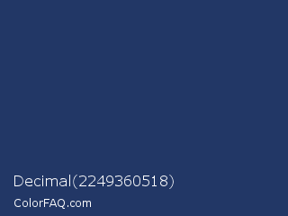 Decimal 2249360518 Color is a dark blue color and the nearest color is Biscay #1b3162. Hex code #223766 and RGB value is rgb(34,55,102). In RGB color space, this color is composed of 13% red, 22% green, 40% blue, In CMYK color space, this color is composed of 67% cyan, 46% magenta, 0% yellow , 60% black , In HSL color space, this color has a hue angle of 221° , 50% saturation and 27% lightness.
