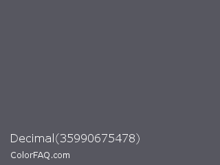 Decimal 35990675478 Color is a normal blue color and the nearest color is Scarpa Flow #585562. Hex code #575760 and RGB value is rgb(87,87,96). In RGB color space, this color is composed of 34% red, 34% green, 38% blue, In CMYK color space, this color is composed of 9% cyan, 9% magenta, 0% yellow , 62% black , In HSL color space, this color has a hue angle of 240° , 5% saturation and 36% lightness.