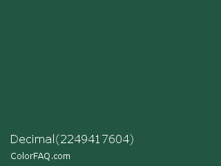 Decimal 2249417604 Color is a dark green color and the nearest color is Brunswick Green #1b4d3e. Hex code #225640 and RGB value is rgb(34,86,64). In RGB color space, this color is composed of 13% red, 34% green, 25% blue, In CMYK color space, this color is composed of 60% cyan, 0% magenta, 26% yellow , 66% black , In HSL color space, this color has a hue angle of 155° , 43% saturation and 24% lightness.