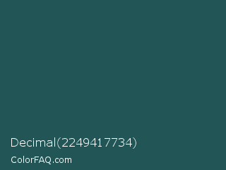 Decimal 2249417734 Color is a dark cyan color and the nearest color is Plantation #27504b. Hex code #225656 and RGB value is rgb(34,86,86). In RGB color space, this color is composed of 13% red, 34% green, 34% blue, In CMYK color space, this color is composed of 60% cyan, 0% magenta, 0% yellow , 66% black , In HSL color space, this color has a hue angle of 180° , 43% saturation and 24% lightness.