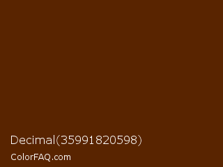 Decimal 35991820598 Color is a very dark orange color and the nearest color is Brown Bramble #592804. Hex code #592400 and RGB value is rgb(89,36,0). In RGB color space, this color is composed of 35% red, 14% green, 0% blue, In CMYK color space, this color is composed of 0% cyan, 60% magenta, 100% yellow , 65% black , In HSL color space, this color has a hue angle of 24° , 100% saturation and 17% lightness.