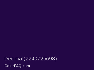 Decimal 2249725698 Color is a very dark violet color and the nearest color is Violet #240a40. Hex code #230746 and RGB value is rgb(35,7,70). In RGB color space, this color is composed of 14% red, 3% green, 27% blue, In CMYK color space, this color is composed of 50% cyan, 90% magenta, 0% yellow , 73% black , In HSL color space, this color has a hue angle of 267° , 82% saturation and 15% lightness.