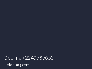 Decimal 2249785655 Color is a very dark blue color and the nearest color is Ebony Clay #26283b. Hex code #232839 and RGB value is rgb(35,40,57). In RGB color space, this color is composed of 14% red, 16% green, 22% blue, In CMYK color space, this color is composed of 39% cyan, 30% magenta, 0% yellow , 78% black , In HSL color space, this color has a hue angle of 226° , 24% saturation and 18% lightness.