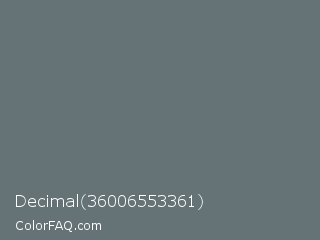 Decimal 36006553361 Color is a normal cyan color and the nearest color is Nevada #646e75. Hex code #657377 and RGB value is rgb(101,115,119). In RGB color space, this color is composed of 40% red, 45% green, 47% blue, In CMYK color space, this color is composed of 15% cyan, 3% magenta, 0% yellow , 53% black , In HSL color space, this color has a hue angle of 193° , 8% saturation and 43% lightness.