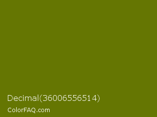 Decimal 36006556514 Color is a dark yellow color and the nearest color is Bronze Yellow #737000. Hex code #657602 and RGB value is rgb(101,118,2). In RGB color space, this color is composed of 40% red, 46% green, 1% blue, In CMYK color space, this color is composed of 14% cyan, 0% magenta, 98% yellow , 54% black , In HSL color space, this color has a hue angle of 69° , 97% saturation and 24% lightness.