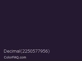 Decimal 2250577956 Color is a very dark violet color and the nearest color is Revolver #2c1632. Hex code #241930 and RGB value is rgb(36,25,48). In RGB color space, this color is composed of 14% red, 10% green, 19% blue, In CMYK color space, this color is composed of 25% cyan, 48% magenta, 0% yellow , 81% black , In HSL color space, this color has a hue angle of 269° , 32% saturation and 14% lightness.