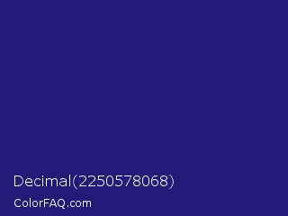 Decimal 2250578068 Color is a dark indigo color and the nearest color is Deep Koamaru #1b127b. Hex code #241976 and RGB value is rgb(36,25,118). In RGB color space, this color is composed of 14% red, 10% green, 46% blue, In CMYK color space, this color is composed of 69% cyan, 79% magenta, 0% yellow , 54% black , In HSL color space, this color has a hue angle of 247° , 65% saturation and 28% lightness.