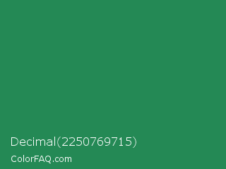 Decimal 2250769715 Color is a normal green color and the nearest color is Eucalyptus #278a5b. Hex code #248955 and RGB value is rgb(36,137,85). In RGB color space, this color is composed of 14% red, 54% green, 33% blue, In CMYK color space, this color is composed of 74% cyan, 0% magenta, 38% yellow , 46% black , In HSL color space, this color has a hue angle of 149° , 58% saturation and 34% lightness.