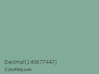 Decimal 140677447 Color is a normal green color and the nearest color is Acapulco #7cb0a1. Hex code #83ab9b and RGB value is rgb(131,171,155). In RGB color space, this color is composed of 51% red, 67% green, 61% blue, In CMYK color space, this color is composed of 23% cyan, 0% magenta, 9% yellow , 33% black , In HSL color space, this color has a hue angle of 156° , 19% saturation and 59% lightness.
