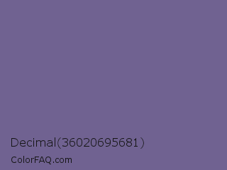 Decimal 36020695681 Color is a normal indigo color and the nearest color is Dark Blue Gray #666699. Hex code #706291 and RGB value is rgb(112,98,145). In RGB color space, this color is composed of 44% red, 38% green, 57% blue, In CMYK color space, this color is composed of 23% cyan, 32% magenta, 0% yellow , 43% black , In HSL color space, this color has a hue angle of 258° , 19% saturation and 48% lightness.