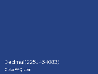 Decimal 2251454083 Color is a normal blue color and the nearest color is Bay Of Many #273a81. Hex code #254183 and RGB value is rgb(37,65,131). In RGB color space, this color is composed of 15% red, 25% green, 51% blue, In CMYK color space, this color is composed of 72% cyan, 50% magenta, 0% yellow , 49% black , In HSL color space, this color has a hue angle of 222° , 56% saturation and 33% lightness.