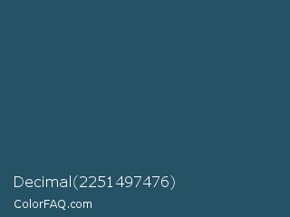 Decimal 2251497476 Color is a dark blue color and the nearest color is San Juan #304b6a. Hex code #255264 and RGB value is rgb(37,82,100). In RGB color space, this color is composed of 15% red, 32% green, 39% blue, In CMYK color space, this color is composed of 63% cyan, 18% magenta, 0% yellow , 61% black , In HSL color space, this color has a hue angle of 197° , 46% saturation and 27% lightness.