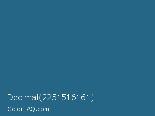 Decimal 2251516161 Color is a normal blue color and the nearest color is Calypso #31728d. Hex code #256585 and RGB value is rgb(37,101,133). In RGB color space, this color is composed of 15% red, 40% green, 52% blue, In CMYK color space, this color is composed of 72% cyan, 24% magenta, 0% yellow , 48% black , In HSL color space, this color has a hue angle of 200° , 56% saturation and 33% lightness.
