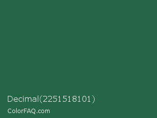 Decimal 2251518101 Color is a dark green color and the nearest color is Green Pea #1d6142. Hex code #256647 and RGB value is rgb(37,102,71). In RGB color space, this color is composed of 15% red, 40% green, 28% blue, In CMYK color space, this color is composed of 64% cyan, 0% magenta, 30% yellow , 60% black , In HSL color space, this color has a hue angle of 151° , 47% saturation and 27% lightness.