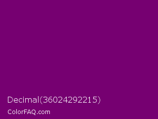 Decimal 36024292215 Color is a dark magenta color and the nearest color is Patriarch #800080. Hex code #760071 and RGB value is rgb(118,0,113). In RGB color space, this color is composed of 46% red, 0% green, 44% blue, In CMYK color space, this color is composed of 0% cyan, 100% magenta, 4% yellow , 54% black , In HSL color space, this color has a hue angle of 303° , 100% saturation and 23% lightness.